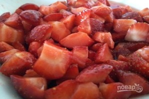 1. Вимийте, почистіть полуницю, відокремте третину для прикрашення десерту. Решту полуниці наріжте довільно дрібними шматочками. Нарізану полуницю перекладіть у миску, посипте 1 ст. л. цукру, додайте лимонний сік і поставте в холодильник, щоб утворився ягідний сік.