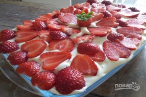 9. Прикрасьте поверхню десерту полуницею за власним смаком і поставте тірамісу в холодильник щонайменше на 3 години перед подачею на стіл.