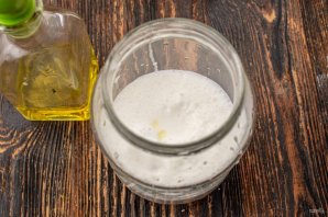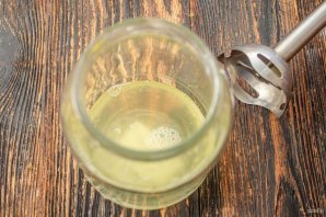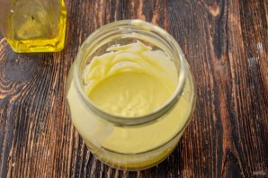 Влийте рослинну олію в кілька прийомів, збиваючи при цьому інгредієнти. Можна використовувати оливкову.