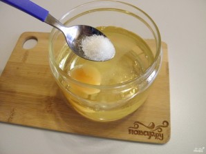 У чашу блендера вбийте яйце і налийте олію. Моя чаша лопнула, тому майонез роблю одразу у скляній банці. Додайте кілька щепоток солі та цукру.