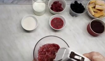 1. Заморожену малину перебийте блендером до стану льодяної крихти. Додайте білки, цукор і взбийте масу міксером, поступово збільшуючи швидкість.