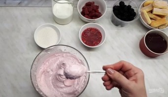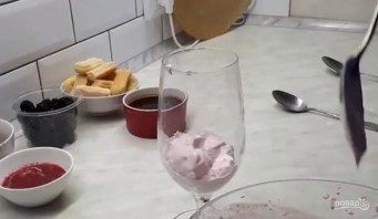 2. Збивайте масу протягом 5 хвилин, щоб вона збільшилася в об'ємі. Крем помістіть у холодильник. Холодні вершки збийте з цукром до щільного крему. Зберіть десерт: акуратно викладіть крем на дно склянки.