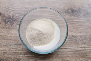 В миску налейте кефир и всыпьте манную крупу, перемешайте.