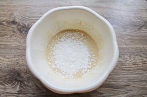Муку смешайте с разрыхлителем и перемешайте. Просейте муку через мелкое сито в миску с яичной массой, перемешайте.