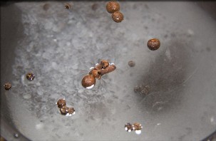 А теперь приступим к приготовлению рассола для чесночных стрелок. Соединяем воду со специями, сахаром и солью. В качестве специй очень хорошо идут любые виды перца.