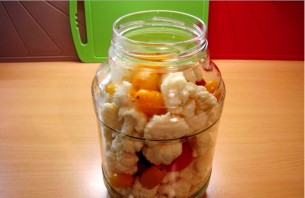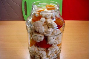 1. Капусту и помидоры моем, даем воде стечь. Капусту делим на соцветия, помидоры нарезаем средними кусочками. Укладываем плотно в банку, чередуя помидоры и капусту.