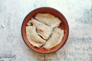 Форму смажьте растительным маслом и выложите филе минтая кожей вниз. Рыбу посолите и поперчите.