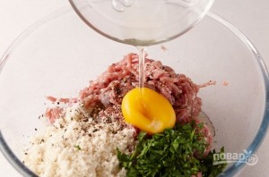 У ємності змішайте фарш з яйцем, зеленню, панірувальними сухарями, посоліть і поперчіть. Добре вимішайте до щільної консистенції.