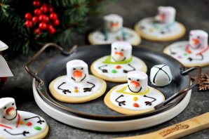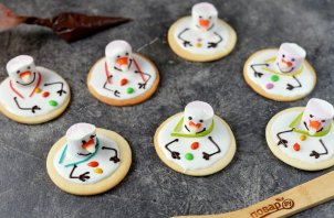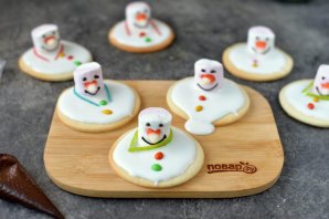 Рецепт не отнимет много времени. Для украшения снеговиков всегда используйте подручные продукты. Носик, например, вы можете нарисовать той же сахарной глазурью, покрасив ее в оранжевый цвет. Пуговки также можете нарисовать цветной глазурью или черным шоколадом Подавайте тёплым или охлаждённым. Идеально к чаю.