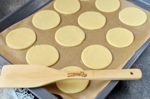 Раскатайте тесто между двумя листами пергамента, вырежьте заготовки любой круглой формой, лучше всего — малым сервировочным кольцом. Переложите заготовки на противень, выстеленный пергаментом и отправьте в холодильник на 10 минут. За это время разогрейте духовку. Отправьте противень в духовку ровно на 10 минут в режиме "верх/низ".