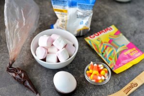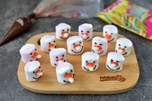 Растопите шоколад, сделайте небольшой надрез на маршмеллоу, вставьте конфету в виде носика, нарисуйте шоколадом глазки и ротик. Дайте время шоколаду застыть.