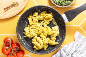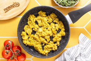 Затем снова перемешайте и разделите части омлета. По желанию можно приправить скрэмбл черным молотым перцем и сушеным чесноком. Готовьте его под крышкой еще 4-5 минут, периодически помешивая.