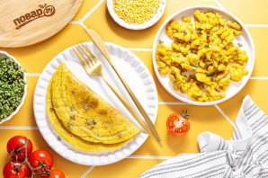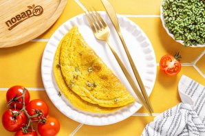 Омлет из желтого маша можно свернуть пополам, пока он еще горячий. По желанию внутрь можно добавить любую начинку.