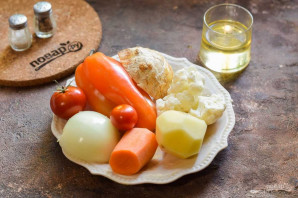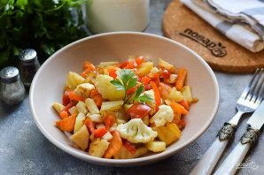 Страва готується без зайвих складнощів. Набір овочів може бути різним, ви можете обирати за власним смаком. Сьогодні ми використовуємо картоплю, цвітну капусту, моркву, цибулю, корінь селеру, томати та перець. Спеції можна додати за смаком, добре підійде паприка, сушений часник. Подавати рагу можна на обід або на вечерю. Беріть на замітку. Готову страву можна подавати до столу.