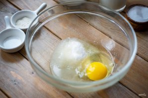 В просторную миску влейте растительное масло, вбейте яйцо, добавьте сахар. Венчиком перемешайте эти ингредиенты.