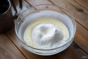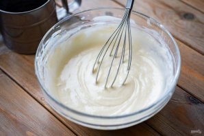 К этой смеси залейте теплый йогурт, перемешайте все венчиком.