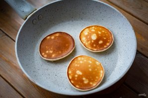 Сухую сковороду с качественным антипригарным покрытием разогрейте на умеренном огне и выкладывайте тесто по одной столовой ложке, формируя панкейки. Обжаривайте с одной стороны до появления пузырьков на поверхности теста, после чего панкейки переверните на другую сторону лопаткой.