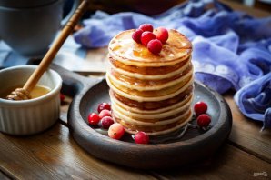 Готовые панкейки выложите на тарелку стопочкой, полейте любимым сиропом, украсьте ягодами, подавайте к столу.