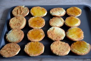 Нанесите абрикосовый джем на одну половину будущего пирожного.