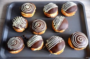 Нанесите шоколадную глазурь поверх пирожных. Это можно сделать с помощью кондитерского мешка, предварительно остудив шоколадную глазурь до рабочего состояния 35-32 градуса. Дайте глазури стабилизироваться.