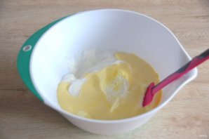 Соедините вместе белковую и желтковую массу, смешайте аккуратно до однородности, стараясь сохранить пышную структуру.
