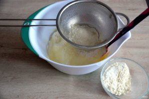 Просейте в миску муку и силиконовой лопаткой смешайте до однородности.