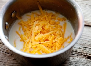 7. У цей час можна приготувати соус. Підсмажте на вершковому маслі борошно кілька хвилин. Тонким струменем влийте молоко та доведіть до кипіння. Додайте сіль, перець і тертій сир. Перемішайте та зніміть з вогню.