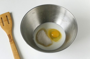 В глубокой миске соедините кефир, яйцо, сахар, ванилин и соль.