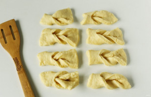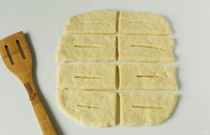 Рабочую поверхность и скалку смажьте растительным маслом. Тесто разделите на 2 части и каждую часть поочередно раскатайте в форме прямоугольника, толщиной около 7-8 мм. Нарежьте тесто на полоски, примерно 3х6 см. В середине каждой получившейся полоски сделайте надрез как на фото.