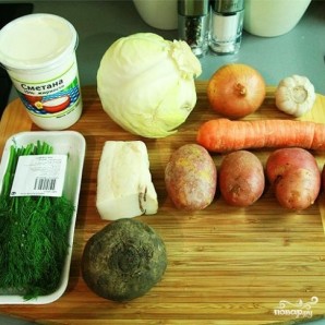 Набір інгредієнтів — традиційний для борщу. М'ясо та овочі.