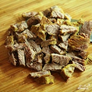 Коли м'ясо охолоне настільки, що з ним можна буде працювати, нарізаємо його на дрібні шматочки і повертаємо назад у каструлю.