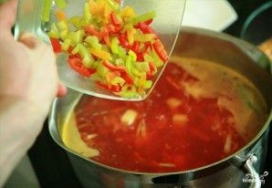 Ще через кілька хвилин додаємо в борщ перець. Продовжуємо варити на середньому вогні.