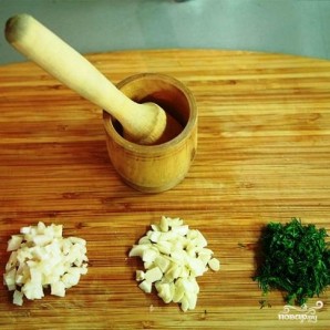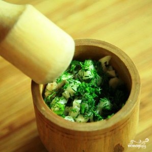 Подрібнюємо три вищезазначених інгредієнти за допомогою ступки.