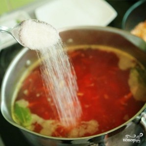 Тепер переходимо до фінального етапу приготування нашого борщу. Спочатку додамо в борщ сіль, цукор і за смаком — чорний перець.
