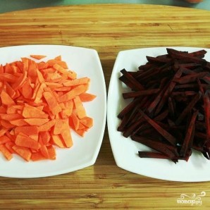Коли бульйон буде готовий — додаємо в нього моркву та буряк, нарізані тонкою соломкою.