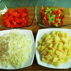 Підготовляємо решту овочів. Капусту тонко нашаркуємо, картоплю нарізаємо невеликими кубиками, помідори та перці — ще дрібнішими кубиками.