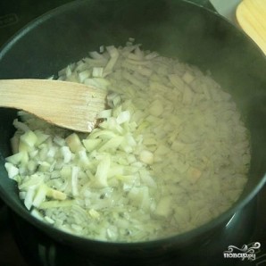 Починаємо приготування зажарки. Розігріваємо на сковороді олію, додаємо туди дрібно нарізаний цибулю.
