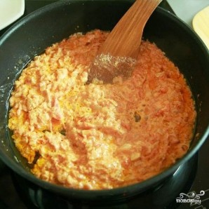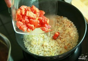 Коли цибуля золотиться — додаємо в сковороду помідори.