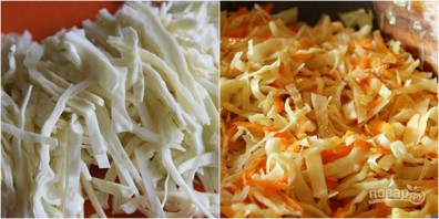 Нашинкуйте капусту, морковь натрите, лук мелко нарежьте. Тушите овощи под крышкой до готовности, не забыв посолить и поперчить по вкусу. К готовым овощам добавьте измельченную зелень, дайте начинке остыть.