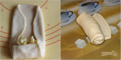Каждый кусочек теста раскатайте как можно тоньше, чтобы он стал почти прозрачным. На край лепешки выложите немного начинки, подверните края и сверните трубочкой.