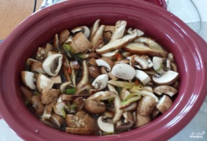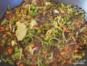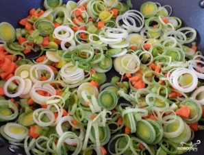 1. У великій сковороді або сотейнику обсмажуємо подрібнений цибулю-порей, моркву, селеру, лавровий лист і подрібнений часник. Окремо окропом заливаємо заморожені гриби, щоб швидше розморозити.