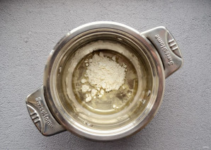 Нагрійте в каструлі з товстим дном олію на середньому вогні. Додайте борошно.
