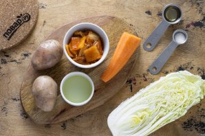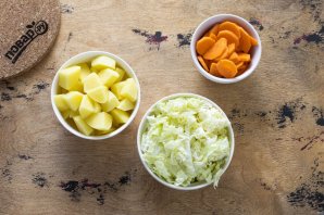 Картоплю помийте, очистіть і наріжте середніми кубиками. Пекінську капусту дрібно нашинкуйте. Моркву очистіть, наріжте тонкими дольками.