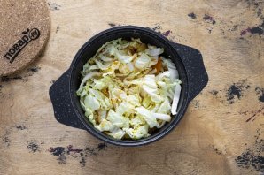 Додайте пекінську капусту. Знову накрийте кришкою та тушкуйте ще 3-5 хвилин до м'якості капусти.