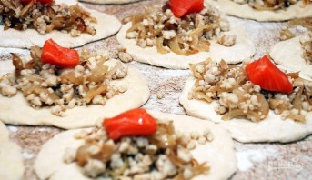 Сворачиваем пироги таким образом, чтобы виднелась начинка. Смазываем поверхность взбитым яйцом и отправляем в духовку, разогретую до 180 градусов на 40-45 минут.