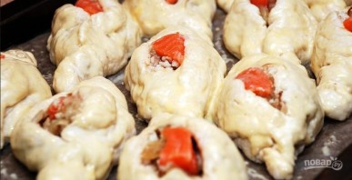 Из теста формируем лепешки, в центр выкладываем начинку, сверху располагаем кусочек филе семги.