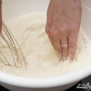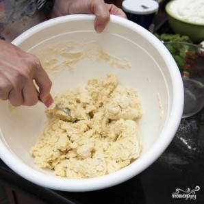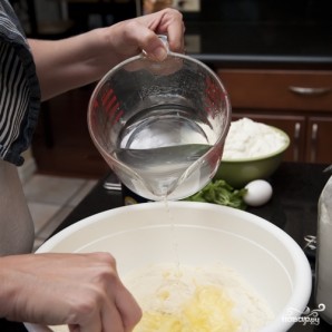 4. Яєчну суміш влийте в ямку, зроблену в борошні, почніть місити. Поступово додавайте кип'ячену воду.