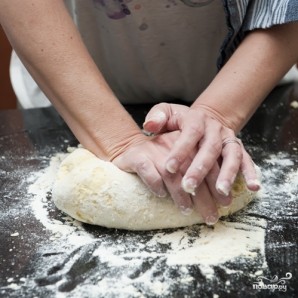 6. Викладіть тісто з миски на робочу поверхню, посипану борошном. Продовжуйте вимішувати руками.