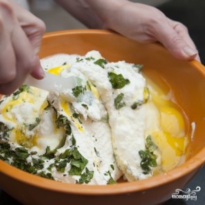 7. В окрему миску викладіть сир рікоту, чотири яйця, чайну ложку солі, чорний перець. Базилік (або петрушку) промийте і дрібно наріжте. Додайте до сиру та яєць. Суміш ретельно перемішайте до однорідної маси.