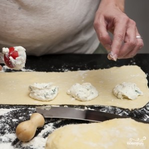 9. На прямокутну смужку розкачаного тіста ложкою викладіть сирну начинку. Залишайте між начинкою відстань 2-3 см.